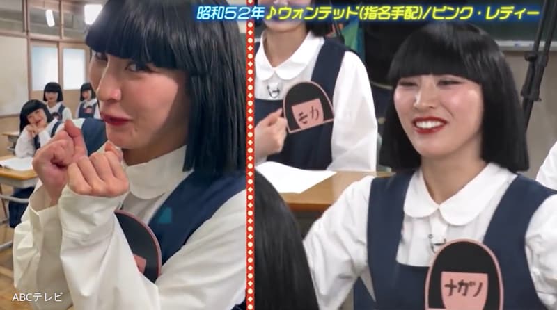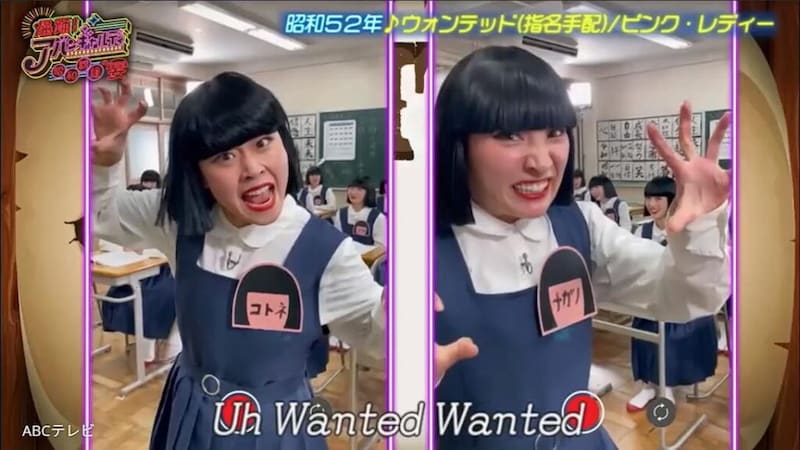 アバンギャルディが踊った1つは、ピンク・レディーの名曲『ウォンテッド(指名手配)』。同楽曲といえば、ピンク・レディーが『NHK紅白歌合戦』初出場時に披露したことでお馴染み。増田いわく、「逃げた恋人を絶対捕まえてやる!」という表情で踊るのがポイントだという。