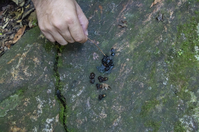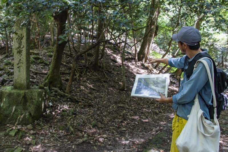 道を歩きながら紹介されるのは、目に見える風景だけではありません。石畳の形状に残る歴史の痕跡や、岩肌に刻まれた石仏、さらには動物のフンや食痕といった小さな手がかりまで、森の中にはさまざまな情報が散りばめられています。