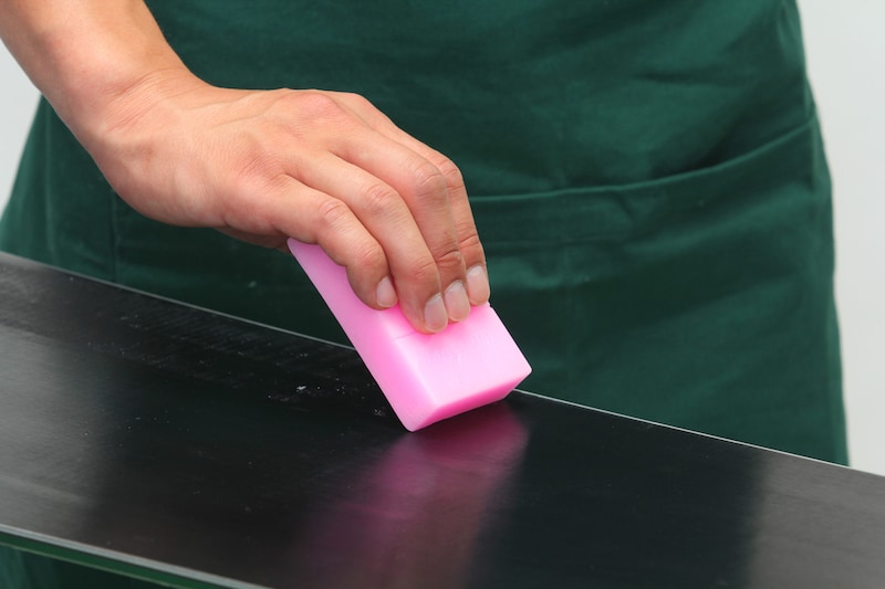 手順4.滑走面全体にワックスをまんべんなく生塗りする。アイロンに固形ワックスを当てて表面を柔らかくしたほうが生塗りしなすくなる。