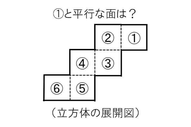 【答】 4立方体のある面に平行な面は、向かい側の面のみ。立方体は一定の方向に面を2つ進めば向かい側の面になるので、1→2→3→4の順に進みます。この中に左方向がちょうど2つ含まれていますから、1と4が平行な面となります。