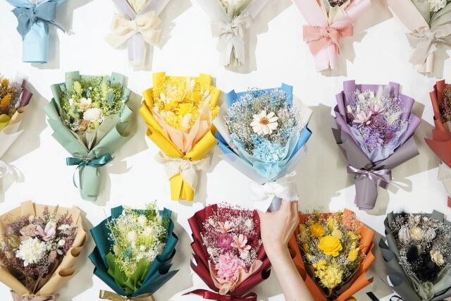 銀座店・有楽町店で人気を集める「推しカラー花束」にも注目を。多彩なカラーバリエーションから、推しのイメージに合わせた花束を作成。ライブやイベントの記念、誕生日ギフト、自分へのご褒美として“枯れない思い出”を形にできます。