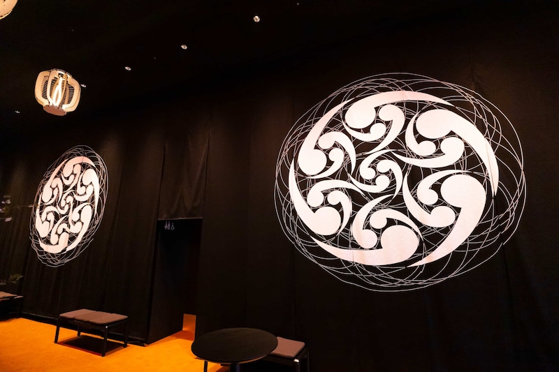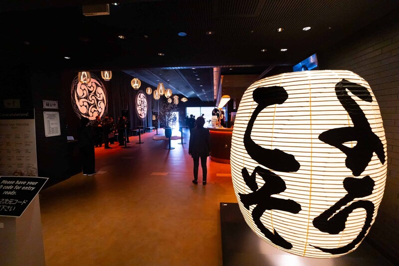 劇場には開演の45分前から入場可能。ラウンジ入り口の提灯は江戸時代から続く「小嶋商店」、暖簾は大正創業の「のれん中むら」、それぞれと共同制作したもの。描かれている紋もオリジナルです。「アップデートされた日本文化」を感じさせるデザインで、伝統と革新が融合した空間になっています。