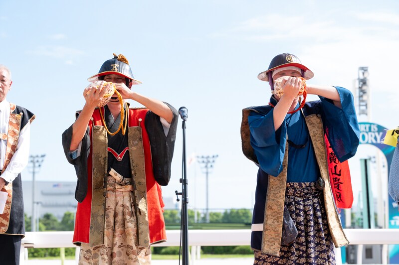 開会にあたり、相馬野馬追代表世話人の門馬光清軍師は「相馬野馬追は今から一千有余年前、平将門公が敵兵に見立てた野馬を追う軍事訓練を行ったのが始まりです。甲冑競馬や神旗争奪戦など、人馬一体の妙技はまさに戦国の時代を今に伝えるものです」とあいさつ。続いて、法螺貝による「礼螺(れいがい)」吹奏や、民謡「相馬流れ山」の斉唱が披露され、発走ファンファーレも「発馬の螺(はつばのかい)」に置き換えて奏でられた。