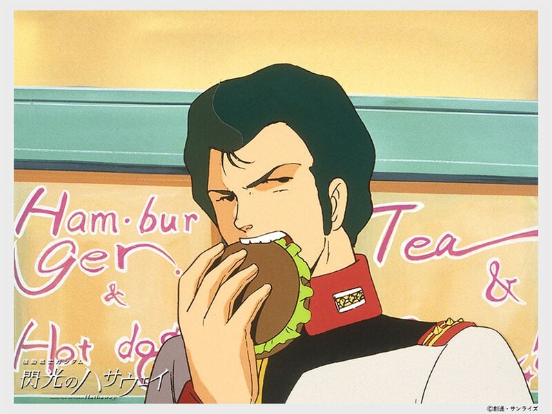 「ガンダム」シリーズの食事シーンには、ハンバーガーをほおばる描写も散見される。『閃光のハサウェイ』場面写真配布キャンペーン「ノア家のアルバム」より (C)創通・サンライズ