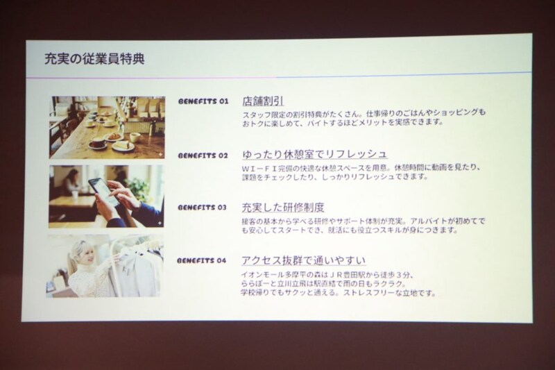 他にもスキルアップのための資格試験の用意や、SCによってトイレなどの環境整備が整っている点も、路面店舗にはない魅力だと訴えかけました。