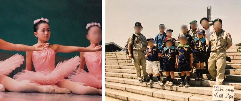 (左)バレエの発表会 (右)ボーイスカウト。右から3人目青いリボンの少女が中村さん