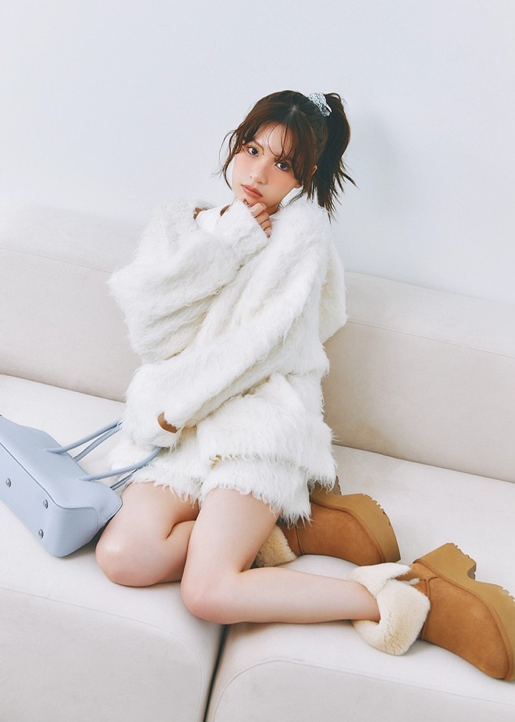 ニットフーディトップス 11,990円、ショートパンツ 6,490円/ともにdazzlin 中に着たタンクトップ 6,050円/ Mardi Mercredi(MARDI MERCREDI JAPAN)バッグ 110,000円/エポイ(エポイ 本店)ブーツ 38,500円/アグ®(デッカーズジャパン)シュシュ 1,390円/NADIA FLORES EN EL CORAZON