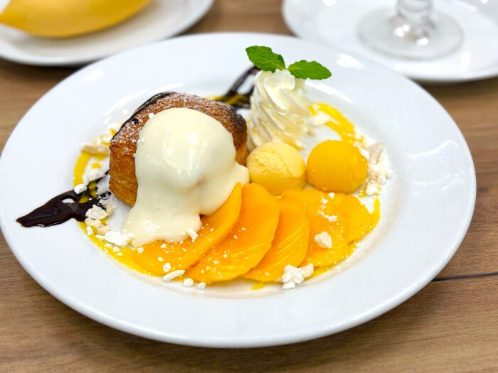マンゴーやマンゴーソルベ、マンゴーソースを彩りよく盛り合わせ、焼きたてのデニッシュにレモンチーズクリームをとろ~り。