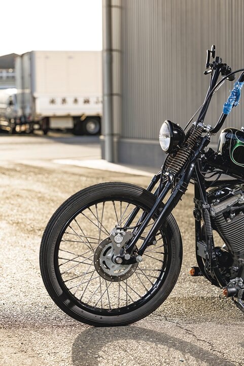 フォークは信頼性の高いW&Wの74スプリンガーを採用。エイプバーとの相性も抜群。ブレーキも同じくW&Wのディスクブレーキで制動力を確保する。
