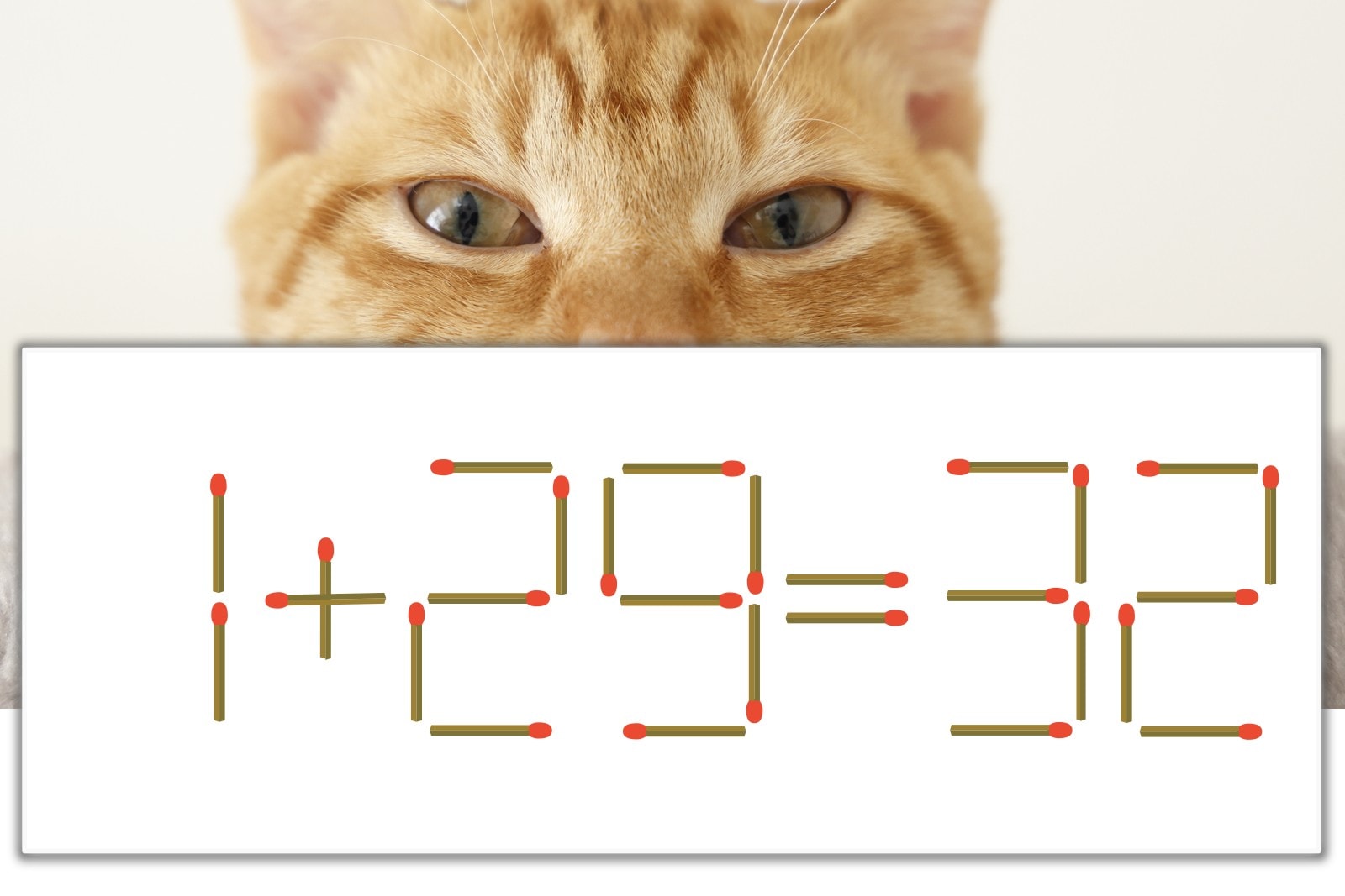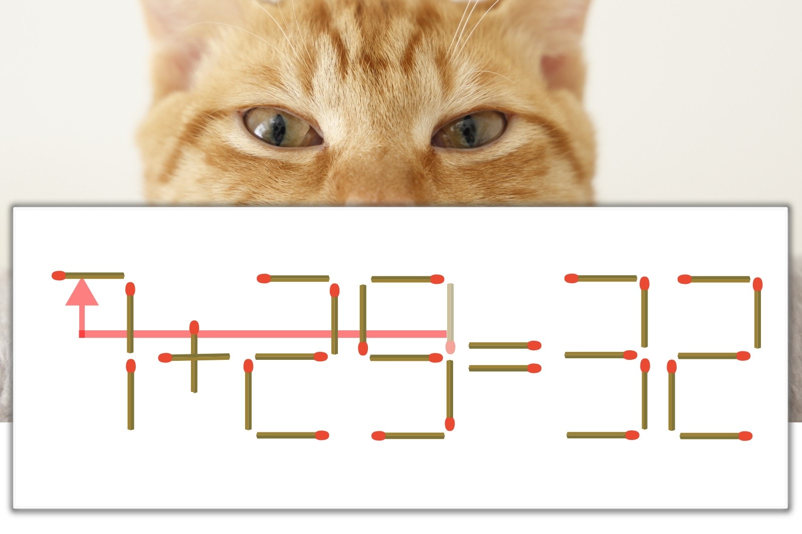「9」を別の数字に変化させると答えが導き出せます。「9」のマッチ棒を1本移動して、「1」を「7」にしてみましょう。すると、「7+25=32」が成立します。