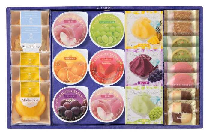 フリュイジュレ(白桃・とちあいか・温州みかん・グレープ・シャインマスカット)やフルーツシャーベット(マスカット・グレープ・パイナップル)に加え、バターマドレーヌ・アールグレイマドレーヌ、クッキー4種を詰め合わせた贅沢な内容です。