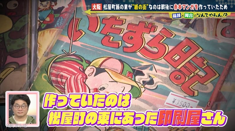 「赤本」とは戦後間もない頃、粗悪な紙で作られ、表紙に赤色を多用したマンガ本のこと。当時、正規の書店では扱われず、主にオモチャ屋さんで売られていた。つまり松屋町筋で売られていた「赤本」を作っていたのが東側にあった紙屋さん。戦後の資材不足でまともな本が出版されない中、印刷屋さんで余った用紙や粗悪な紙を使って安価で製本したのだとか。