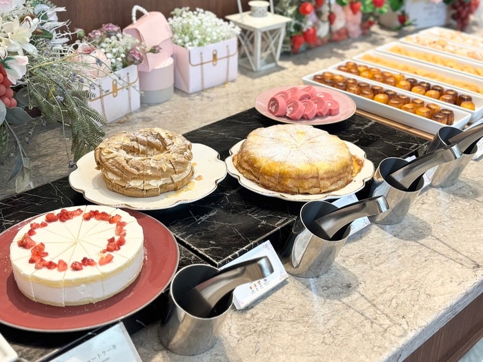 お食事のあとはティータイム♪デザートカウンターには、ミニサイズの焼き菓子をはじめ「苺のショートケーキ」や「パリ・ブレスト」など本格的なデザートがたくさん並んでいます。