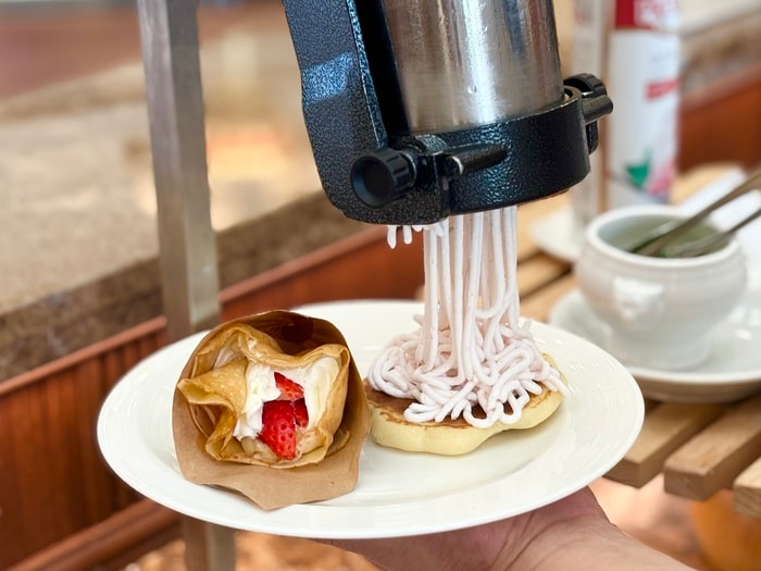 自動パンケーキマシンが登場!手をかざすだけで焼きあがる「自分だけのパンケーキ」トッピングは、スモークサーモンやツナマヨなどのお食事系から、セルフで絞る「苺のモンブランクリーム」まで、アレンジは自由自在。