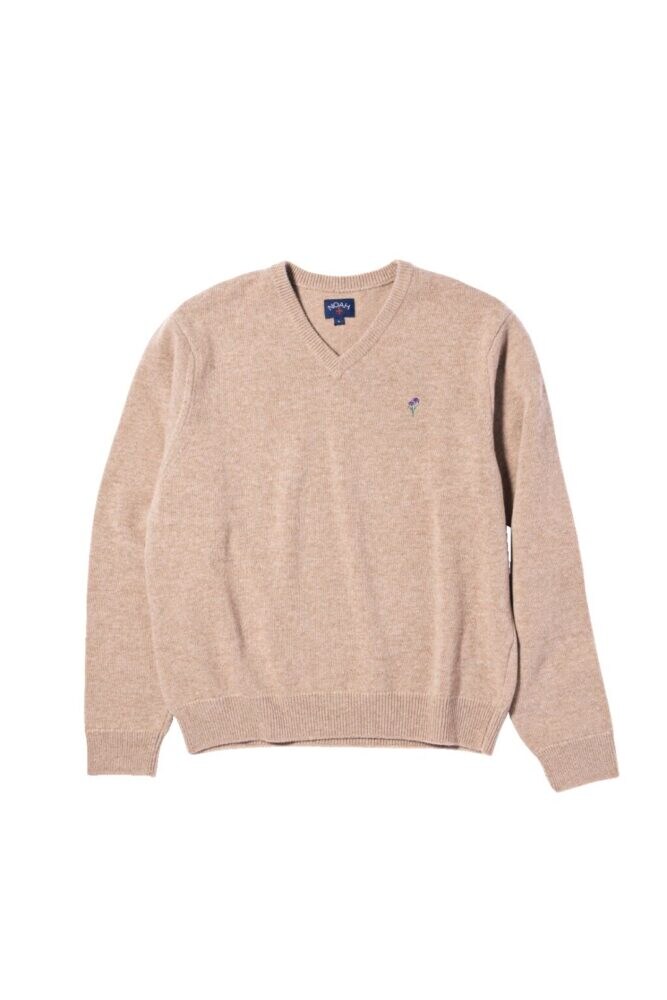 スーパーファイン・ジーロングウールを使用した襟・袖口・裾がリブ仕様のVネックニット。胸元にさりげなく入ったアイリスの刺繍が効く。4万9500円(ノア クラブハウスTEL03-5413-5030)