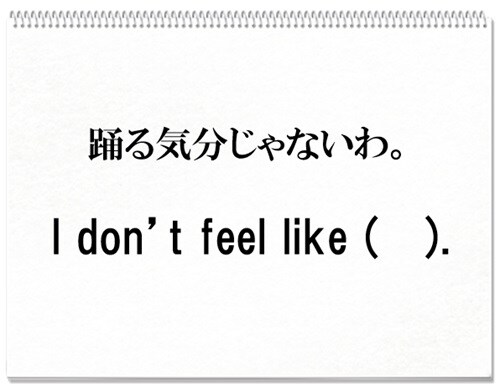 【答】 dancing【会話例】 Come on, go and dance with him. さぁ、行って彼と踊りなよ。 No, I don’t feel like dancing. ううん、踊る気分じゃない。【表現のポイント】 “like”の後ろは必ずing形。to不定詞、普通の名詞は使えません。