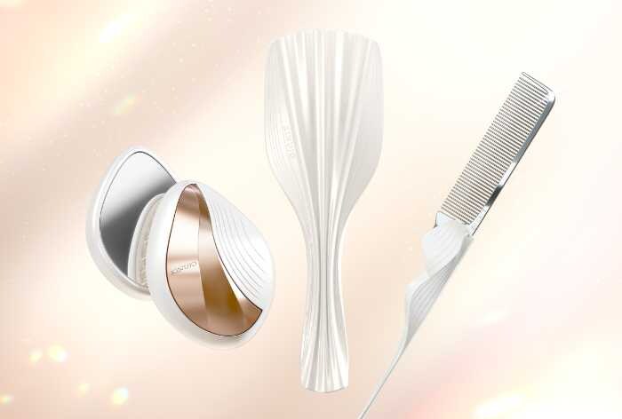ミラー付きで持ち運びしやすい「KINUJO Silky jewel brush」は、シルク成分配合ピンと静電気防止設計で、さらりとまとまる仕上がりに。
