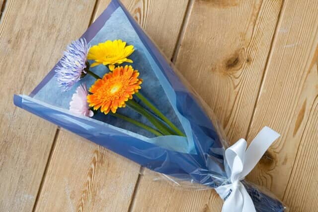染めたガーベラの他に3輪選び、夜空に見立てた包み紙で花火を思わせるラッピング。旅のお土産になりました。