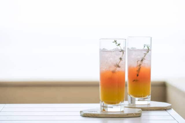 昼の時間帯に提供される「花咲く彩りモクテル」は、一番下が静岡のミカンジュース、2層目がいちごサイダーで、ガーベラや花火の豊かな色彩を表現しています。ほんのり炭酸で甘酸っぱく、春にぴったりのドリンクです。「花咲く彩りモクテル」は17時まで。17時から21時までは飴細工で花火を模した「花咲く煌めきモクテル」が登場します。