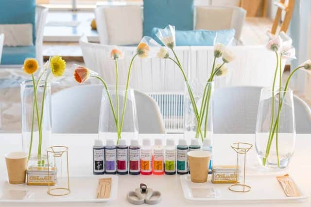 ガーベラの花びらがパッと開く様子が花火に似ていることから、リゾナーレ熱海では染色体験を発案。はじめに白いガーベラを1輪選び、10色の染色液から好きな色を選びます。