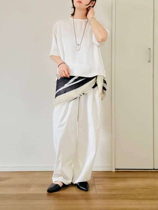 さらに小物で引き締めるのもポイント。黒のシューズやスカーフをプラスするだけで、全体がぼやけずメリハリのある印象に仕上がります。