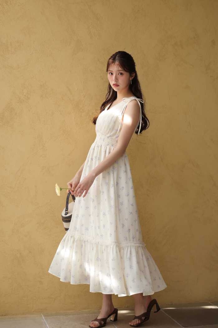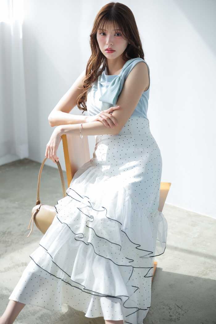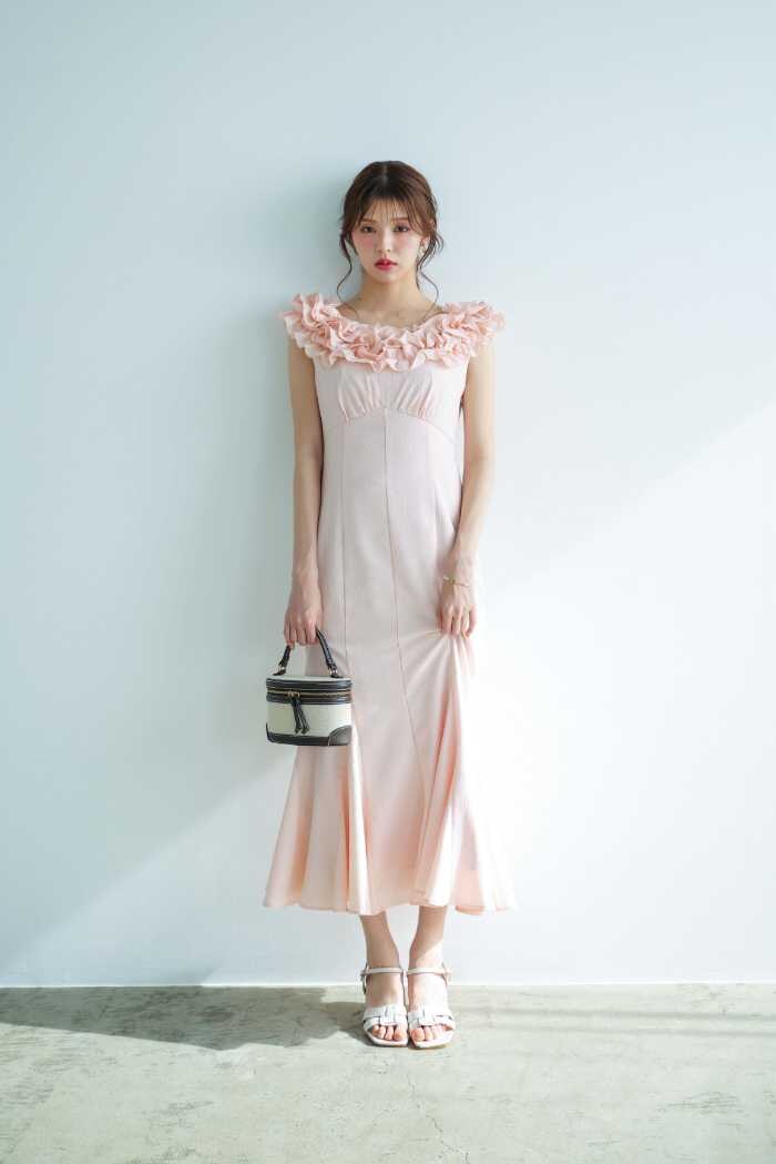 LOOK5はワンピース(15,400円税込)のラッフルフリルで小顔&スタイルアップ。