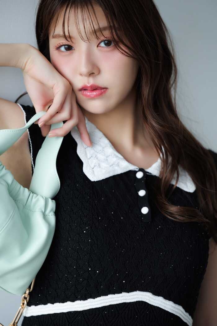 LOOK7はクロシェ編みニットワンピース(14,300円税込)で脚長効果を演出。