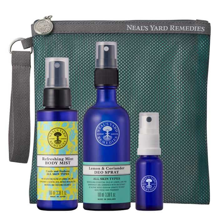 内容:レモン&コリアンダー デオスプレー100mL/リフレッシュミント ボディミスト100mL/ミニスプレーボトル/サマーポーチ(再生ポリエステルなど)