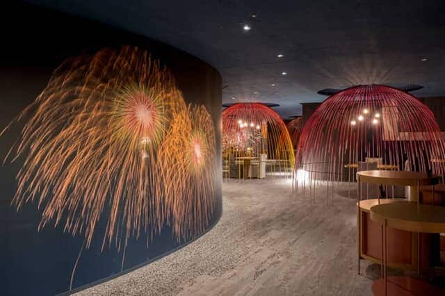 夜空を思わせる深い青色の壁に、星が尾を引きながら放物線を描いて開く冠(かむろ)または冠菊(かむろぎく)と呼ばれる花火をイメージしたドーム型の半個室が点在。テーブルが花火の中にある斬新な空間で食事を楽しめます。