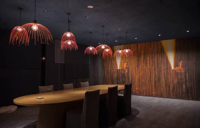 こちらの壁には古くから浜名湖周辺で行われてきた勇壮な手筒花火の装飾がほどこされ、大小の冠菊をかたどった照明が室内にリズムを演出。グループなどでの利用におすすめです。
