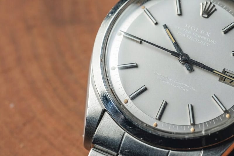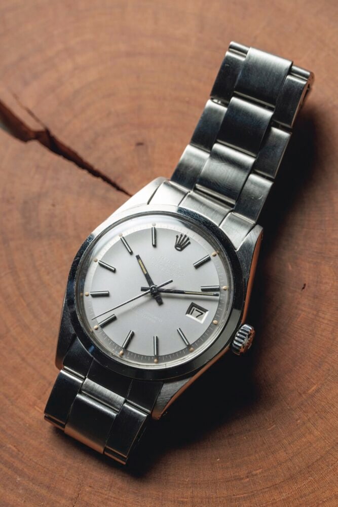 特徴的なベゼルが売りのデイトジャストの中で、もっともミニマルなスムースベゼルを用いたRef.1500。角度によってROLEXやDATEJUSTの文字がほぼ見えず、スムースベゼルがよりシンプルな印象を与えており、なんとも魅力的な表情。文字盤と針の夜光が均等に焼けているのもポイントが高いだろう。
