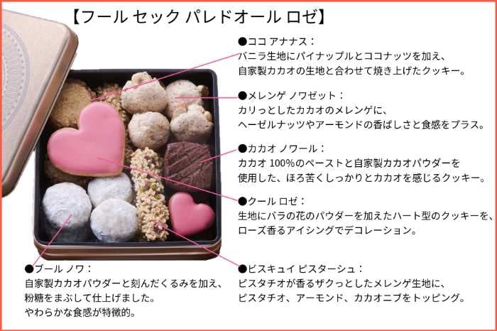 ローズが香るハート型クッキーを中心に、自家製カカオパウダーやカカオニブを使用した多彩な焼き菓子を詰め合わせています。