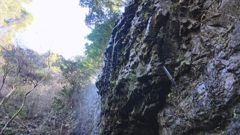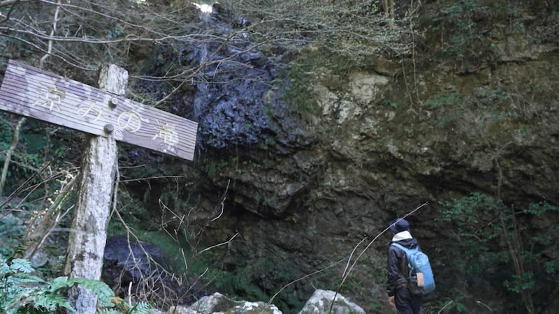 今回のルートは全長2.3kmの短距離コース。「山頂まで2kmちょっと、距離的にはそんなでもないか」と余裕の表情でスタートを切った前川さん、階段が施されてよく整備された登山道に入るとさっそく「涼みの滝」に差し掛かります。この季節、まだ水量は少なめですが、夏の登山時にはさぞや爽やかな水の音に癒されることでしょう。そんなことを想像しながら登山を続けます。