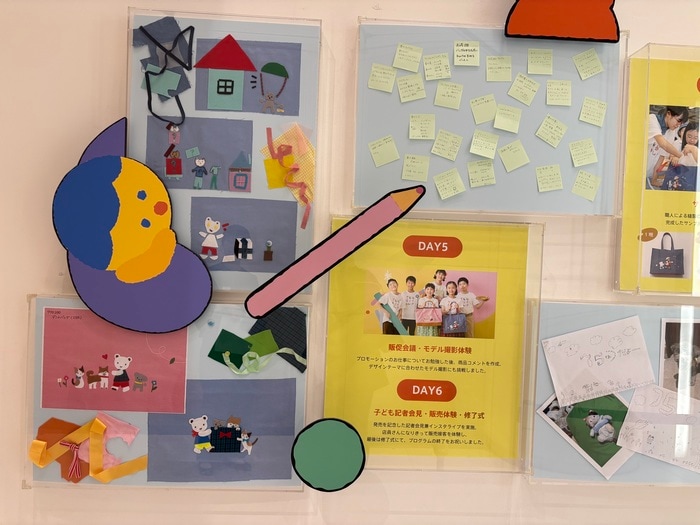神戸本店一階に展示されてある「子ども企画会議」は、創業75周年を記念して開催された特別イベント。ファミリアのロングセラーアイテムである「デニムバッグ」の“企画”から“販売”までの工程を約8か月間にわたり体験。