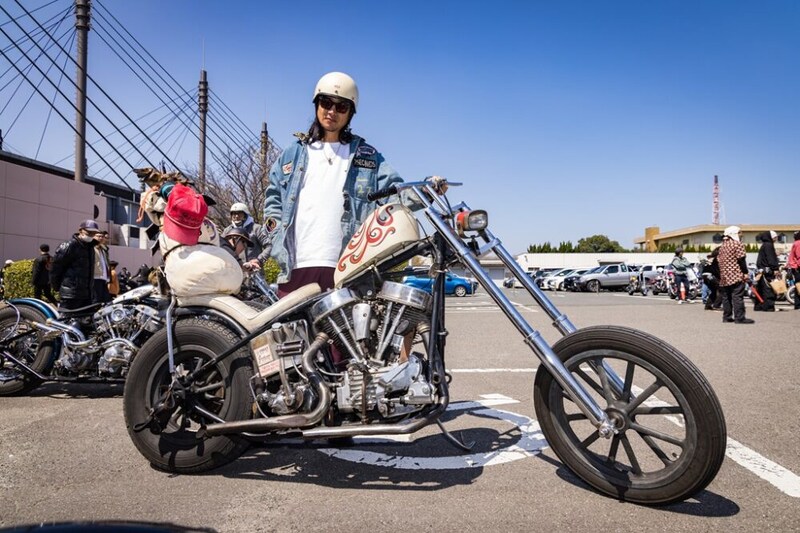 雰囲気のあるオールドスクールチョッパーで来場した飯星さん。ホワイトのガスタンクに同色のシートを合わせるなど、センスある配色&パーツチョイスが魅力的だ。なんと飯星さんは沖縄からの参加。ショー後は九州でライディングを楽しむ予定だと話してくれた。
