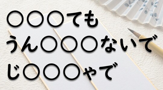 下のような川柳があります。「○○○ても」の「○○○」には平仮名が3文字入ります。この3文字は、そのあとの「うん○○○ないで」と「じ○○○ゃで」の「○○○」と同じ文字です。「○○○」に共通する3文字を入れて、川柳を完成させてください!