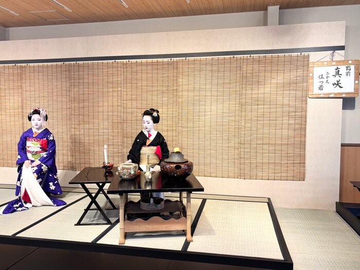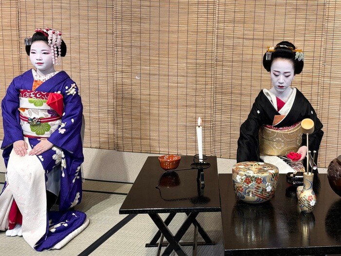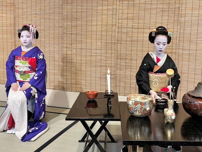 「都をどり」の公演前に「お茶席」という通常ではお座敷でしか会うことが出来ない芸妓さんのお点前にて、お抹茶とお茶菓子が振る舞われます。