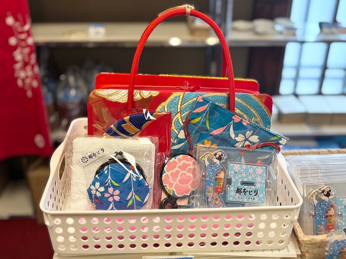 公演前から購入できる「都をどり」オリジナルグッズ。お着物の生地を使用した「豆かがみ」や、帯で作られた「バッグ」など、ギフトやお土産にも素敵です。