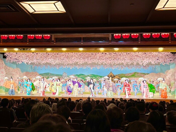 寛永行幸をテーマにした今年の「都をどり」のフィナーレを飾るのは、”二条城”満開の桜と共に、芸妓さん、舞妓さんが一堂に舞台に舞う姿。