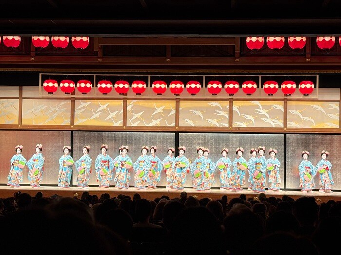 幕が上がると京都祇園甲部歌舞練場(1912年竣工)特有の両花道から揃いの浅葱色(あさぎいろ)の衣裳で踊り子が登場する日が幕開けから始まります。