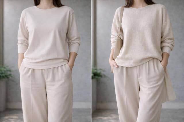 色のトーンを揃える場合こそ、素材の違いが重要。ニットやとろみ素材など、質感に差をつけることで、自然なメリハリが生まれます。