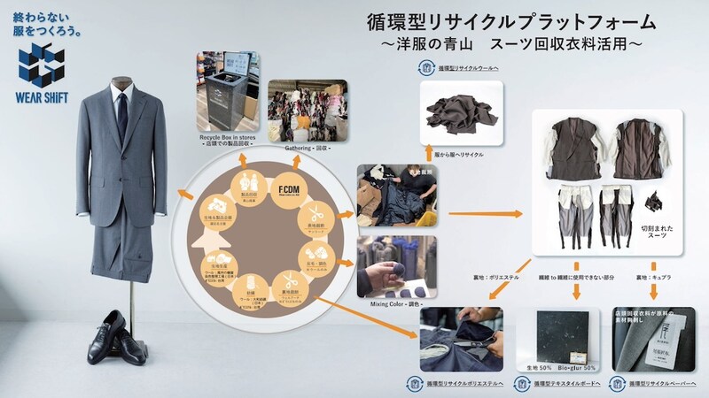青山商事株式会社は、持続可能なファッションの実現を目指す「WEAR SHiFT(ウエアシフト)」プロジェクトの一環として、顧客から店頭で回収したスーツ(裏地など)のポリエステルを再利用した「ウエアシフトスーツ」を、4月14日より洋服の青山全店および、公式オンラインストアで発売を開始しました。