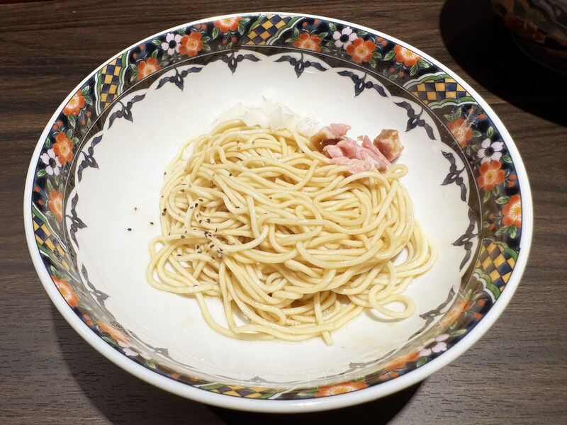 麺を食べ終えたら、ここで替え玉として「ハーフ鶏油の和え玉」をオーダー。たっぷりと鶏油が染み込んだビジュもイイ感じのハーフ鶏油の和え玉が目の前にやってきた。