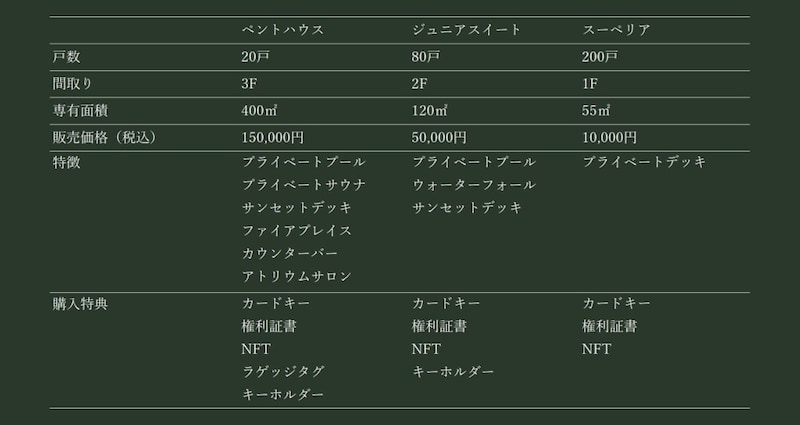 販売されるのは全300戸限定。グレードは3タイプ用意され、低層階の「スーペリア」が1万円、中層階の「ジュニアスイート」が5万円、そして最上階の「ペントハウス」が15万円(いずれも税込)となっている。購入者には、デジタル上の所有権を証明するNFT付の権利証書に加え、実在する「カードキー」や証書が手元に届く仕組みだ。