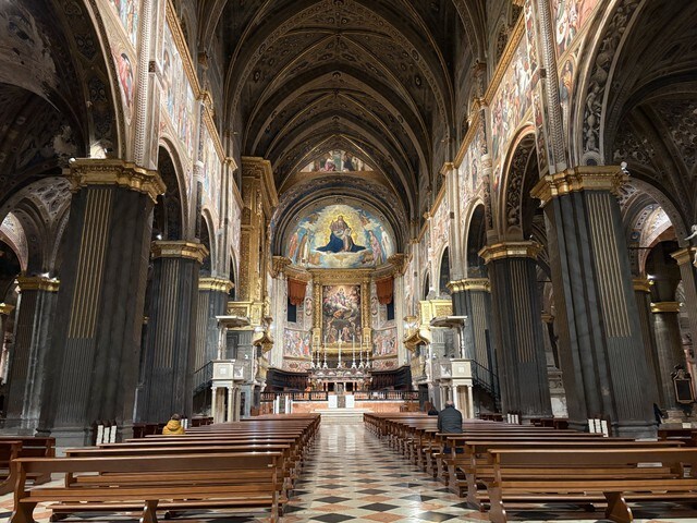 ロマネスク様式、ゴシック様式、ルネサンス様式と複数の建築様式が混ざっているのが特徴で、最大の見どころは内部の壁や天井に描かれたフレスコ画。