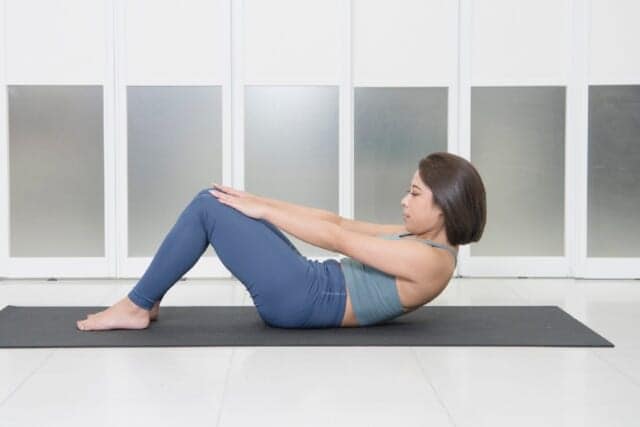 一度息を吸い、お腹を薄く引き込んだ状態をつくります。そのまま息を吐きながら、頭→肩→背骨上部の順にゆっくり持ち上げていきます。手は太ももに沿ってスライドし、ひざ方向へ。お腹を薄く保ったまま息を吸いながら、背骨上部→肩→頭の順でゆっくりと床に戻します。反動を使わず、背骨を一つずつ置くイメージで5回を目安に行いましょう。