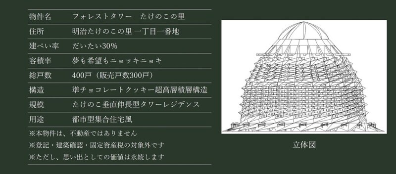 物件名は「フォレストタワー たけのこの里」で、容積率は「夢も希望もニョッキニョキ」、構造は「純チョコレートクッキー超高層積層構造」とのこと。