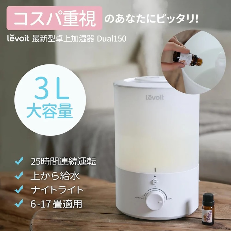 そんな使い方ができそうなのが、アメリカで最も売れている空気清浄機ブランド「Levoit(レボイト)」の超音波式加湿器「Dual150」です。