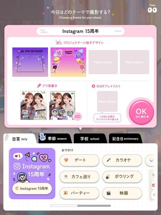 『EVERFILM』をプレイする際、最初のテーマ選択画面で「Instagram15周年」を選択することで、本コラボレーションのデザインで撮影を楽しむことができます。