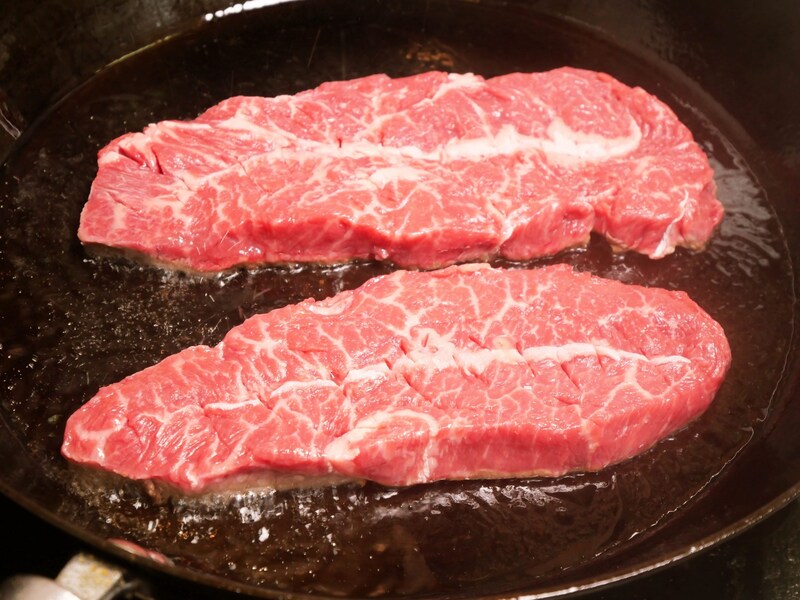 フライパンを熱してから多めの油をひいた。今回は、油っぽさをできるだけ無くすため、あっさりテイストに仕上がりやすい米油を使用した。強火で油が熱々になったら、そこに牛肉を入れて焼く。
